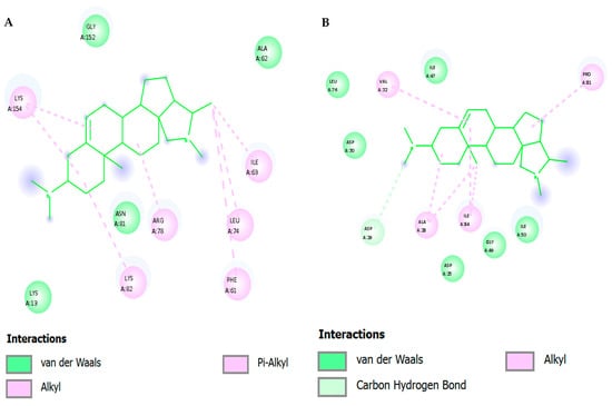 Human immunodeficiency virus (HIV-1) and SARS-CoV-2 continue to co-burden global health, motivating discovery of broad-spectrum small molecules. Conessine, a steroidal alkaloid, has reported membrane-active and antimicrobial properties but remains underexplored as a dual antiviral chemotype. To interrogate conessine’s multi-target antiviral potential against key enzymatic and entry determinants of HIV-1 and SARS-CoV-2 and to benchmark performance versus approved comparators. Eight targets were modeled: HIV-1 reverse transcriptase (RT, 3V81), protease (PR, 1HVR), integrase (IN, 3LPT), gp120–gp41 trimer (4NCO); and SARS-CoV-2 main protease (Mpro, 6LU7), papain-like protease (PLpro, 6W9C), RNA-dependent RNA polymerase (RdRp, 7BV2), spike RBD (6M0J). Ligands (conessine; positive controls: dolutegravir for HIV-1, nirmatrelvir for SARS-CoV-2) were prepared with standard protonation, minimized, and docked using AutoDock Vina v 1.2.0exhaustiveness 4; 20 poses). Binding modes were profiled in 2D/3D. Protocol robustness was verified by re-docking co-crystallized ligands (RMSD ≤ 2.0 Å). Atomistic MD (explicit TIP3P, OPLS4, 300 K/1 atm, NPT; 50–100 ns) assessed pose stability (RMSD/RMSF), pocket compaction (Rg, volume), and interaction persistence; MM/GBSA provided qualitative energy decomposition. ADMET was predicted in silico. Conessine showed coherent, hydrophobically anchored binding across both viral panels. Best docking scores (kcal·mol−1) were: HIV-1—PR −6.910, RT −6.672, IN −5.733; SARS-CoV-2—spike RBD −7.025, Mpro −5.745, RdRp −5.737, PLpro −5.024. Interaction maps were dominated by alkyl/π-alkyl packing to catalytic corridors (e.g., PR Ile50/Val82, RT Tyr181/Val106; Mpro His41/Met49; RBD L455/F486/Y489) with occasional carbon-/water-mediated H-bonds guiding orientation. MD sustained low ligand RMSD (typically ≤1.6–2.2 Å) and damped RMSF at catalytic loops, indicating pocket rigidification; MM/GBSA trends (≈ −30 to −40 kcal·mol−1, dispersion-driven) supported persistent nonpolar stabilization. Benchmarks behaved as expected: dolutegravir bound strongly to IN (−6.070) and PR (−7.319) with stable MD; nirmatrelvir was specific for Mpro and displayed weaker, discontinuous engagement at PLpro/RdRp/RBD under identical settings. ADMET suggested conessine has excellent permeability/BBB access (high logP), but liabilities include poor aqueous solubility, predicted hERG risk, and CYP2D6 substrate dependence.Conessine operates as a hydrophobic, multi-target wedge with the most favorable computed engagement at HIV-1 PR/RT and the SARS-CoV-2 spike RBD, while maintaining stable poses at Mpro and RdRp. The scaffold merits medicinal-chemistry optimization to improve solubility and de-risk cardiotoxicity/CYP interactions, followed by biochemical and cell-based validation against prioritized targets.