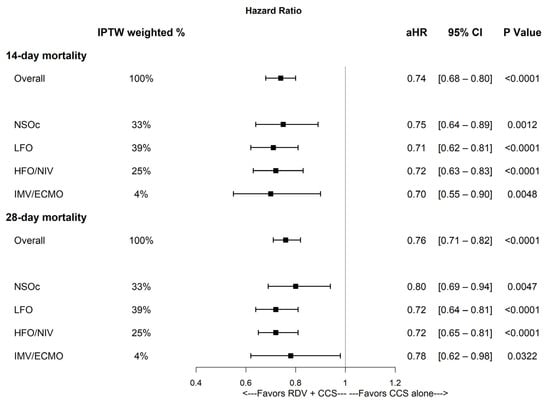 Patients with chronic obstructive pulmonary disease (COPD) are vulnerable to developing severe SARS-CoV-2 infection. This retrospective study evaluated the effectiveness of remdesivir (RDV) initiated with corticosteroids (CCS) versus CCS only in patients with COPD hospitalized for SARS-CoV-2 infection during the Omicron period from December 2021 to February 2024. The analysis used patient-level data from the large, geographically diverse, US hospital administrative billing PINC AI healthcare database. Inverse probability of treatment weighting was used to adjust for potential confounding and enable a scientifically robust comparative assessment of differences in outcomes between treatment groups. Initiation of RDV with CCS upon admission for SARS-CoV-2 infection was associated with a lower mortality risk at 14 and 28 days with an overall adjusted hazard ratio [95% CI] of 0.74 [0.68–0.80] and 0.76 [0.71–0.82], respectively, compared to initiation of CCS only. The combination of RDV and CCS was also associated with a lower mortality risk at 14 and 28 days for patients across baseline oxygen requirements compared to CCS only. These results highlight the benefit of timely RDV treatment in COPD patients hospitalized with SARS-CoV-2 infection and underscore the value of considering established treatment paradigms in the context of the most recent collective evidence.