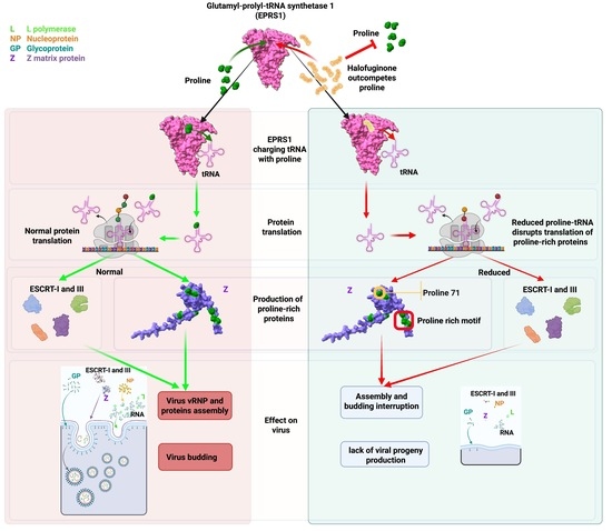 Several mammarenaviruses (MaAv), chiefly Lassa virus (LASV) in Western Africa and Junin virus (JUNV) in the Argentinean Pampas, cause severe disease in humans and pose important public health problems in their endemic regions. In addition, the globally distributed MaAv lymphocytic choriomeningitis virus (LCMV) is an underrecognized human pathogen of clinical significance, especially in congenital infections, and LCMV poses a serious risk for immunocompromised individuals. There are no FDA-approved MaAv vaccines or antivirals, and current anti-MaAv therapy is limited to an off-label use of ribavirin, whose efficacy remains controversial. This highlights an urgent unmet need for developing antivirals against human pathogenic MaAv. Halofuginone (HF), a derivative of the natural alkaloid febrifugine, has been shown to exhibit antiviral activity against several RNA viruses. Here, we present evidence that HF exhibits potent dose-dependent antiviral activity against LCMV, and against the hemorrhagic fever causing MaAv LASV and JUNV. HF binds to the bifunctional enzyme glutamyl-prolyl-tRNA synthetase 1 (EPRS1) and specifically inhibits its prolyl-tRNA synthetase (PRS) activity, resulting in translation inhibition via the amino acid starvation (AAS) response with preferential impact on proline-rich proteins. HF anti-LCMV activity was prevented by the addition of exogenous proline supporting that inhibition of PRS activity plays a critical role in the anti-MaAv activity of HF. We found that HF did not affect LCMV cell entry, modestly (twofold) reduced the activity of the virus ribonucleoprotein (vRNP), but strongly inhibited (>90%) Z budding activity, a process involving the Z proline-rich late domain motifs.