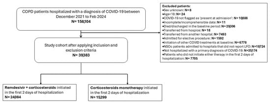 Patients with chronic obstructive pulmonary disease (COPD) are vulnerable to developing severe SARS-CoV-2 infection. This retrospective study evaluated the effectiveness of remdesivir (RDV) initiated with corticosteroids (CCS) versus CCS only in patients with COPD hospitalized for SARS-CoV-2 infection during the Omicron period from
