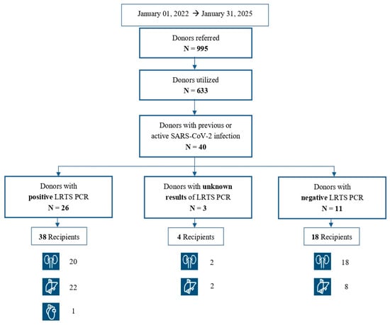 At the beginning of the COVID-19 pandemic, SARS-CoV-2-positive donors were not considered eligible for organ donation. The Italian National Transplant Centre has gradually introduced measures to prevent donor-to-recipient transmission of SARS-CoV-2 infection through organ transplantation. The current national screening protocol for deceased SARS-CoV-2-positive donors recommends molecular testing of donor lower respiratory tract (LRT) samples, graft biopsies and organ perfusion fluids. The aim of the study is to describe the 3-year experience of protocol application in a northern region of Italy. From 1 January 2022 to 31 January 2025, a total of 132 samples were analyzed (29 liver biopsies, 35 kidney biopsies, 68 perfusion fluids) from 40 organ donors with an active or resolved SARS-CoV-2 infection. SARS-CoV-2 PCR on LRT samples was positive in 26/40 (65%) donors, negative in 11/40 (27.5%) cases and in the remaining 3 (7.5%) the PCR result was unknown. Overall, 65 organs were transplanted into 60 recipients. All processed graft biopsies and organ perfusion fluid samples tested negative for SARS-CoV-2 RNA. Our data suggest that the utilization of non-lung donors with resolved or active SARS-CoV-2 infections who died of other causes appears justified and safe.