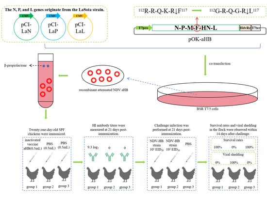 Genotype VII Newcastle disease virus (NDV) has been confirmed as the predominant epidemic strain in China. Traditional vaccine strains fail to provide complete immune protection when challenged with an epidemic strain. NDV vaccines with phylogenetic relationships closer to those of the endemic viruses demonstrate improved protective efficacy in reducing viral shedding and transmission. This research seeks to develop attenuated vaccine strains that are specifically aligned with NDV genotype VII. A reverse genetics system for the genotype VII NDV HB strain was developed, successfully rescuing the attenuated recombinant virus aHB by substituting the fusion protein (F) cleavage site motif “112R-R-Q-K-R↓F117” with “112G-R-Q-G-R↓L117.” Recombinant aHB virus attenuation was verified by assessing the mean death time (MDT) and intracerebral pathogenicity index (ICPI). The attenuated aHB strain demonstrated greater proliferation titers than did the virulent HB and rHB strains both in vivo and in vitro. Furthermore, the genome exhibited significant genetic stability even after 10 passages in chicken embryos. When challenged with the HB strain of NDV genotype VII, the aHB-inactivated vaccine provided 100% protection to chickens and effectively prevented viral shedding. These findings indicate that recombinant aHB may serve as an effective vaccine candidate.