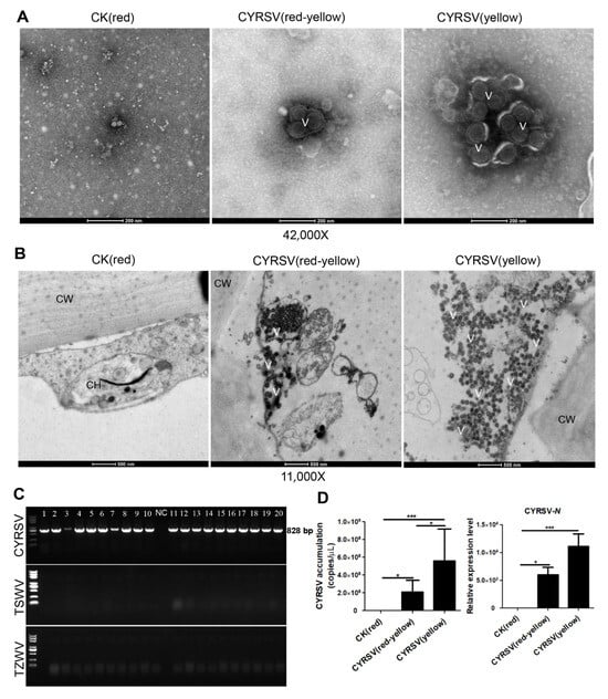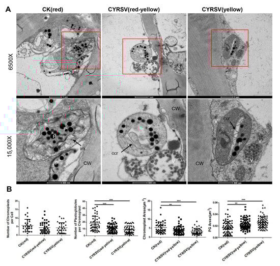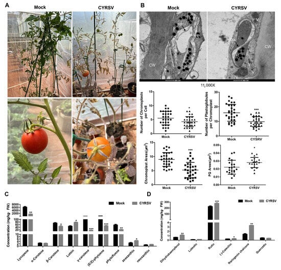 Chilli yellow ringspot orthotospovirus (CYRSV) causes colored lesions in tomato fruits. In this study, tomato fruits with different-colored lesions were used as experimental materials to explore the color formation mechanism. After CYSRV infection, the structure of chromoplasts inside the cells of tomato fruits