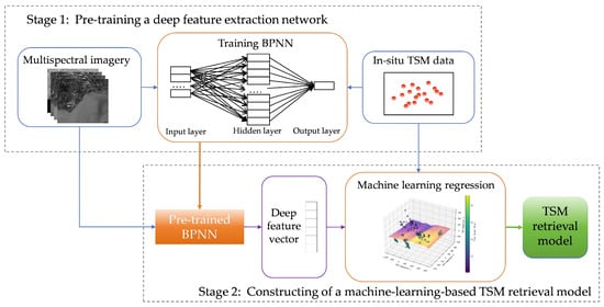 Accurate monitoring of total suspended matter (TSM) concentration is essential for aquatic ecosystem protection and water quality assessment. Multispectral remote sensing provides an effective approach for large-scale TSM monitoring. However, robust retrieval models are difficult to develop due to limited in situ data. This study presents a Deep Feature Extraction–Machine Learning fusion framework that integrates a pre-trained back-propagation neural network (BPNN) with support vector regression (SVR) to enhance TSM retrieval. High-level spectral features extracted by BPNN are used as inputs to SVR (termed DFE-SVR) for regional TSM retrieval, using in situ measurements from five inland lakes in Jiangsu and Anhui Provinces, China. The generated TSM maps showed spatial patterns consistent with TSM concentration distributions visually observed in true-color imagery. Validation results demonstrated that DFE-SVR outperformed BPNN and SVR models, achieving R2 of 0.85 and 0.90 and RMSE of 7.95 and 4.76 mg/L for GF-1 and Sentinel-2 imagery, respectively. Compared with SVR models using principal component analysis or band combinations, DFE-SVR reduced RMSE by over 20%. Under reduced training samples, the DFE-SVR model also maintained higher stability and accuracy. These findings showed its potential for multispectral water quality monitoring with limited in situ data.