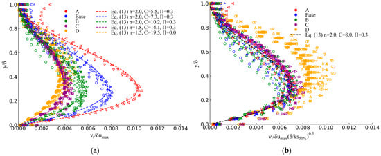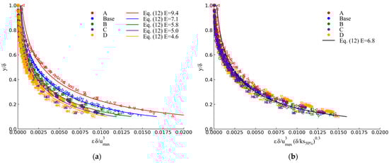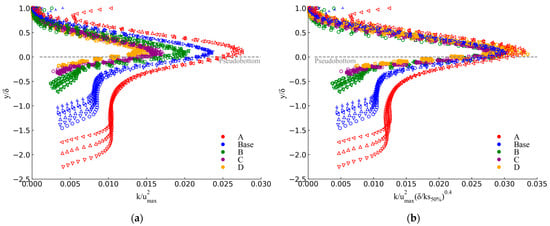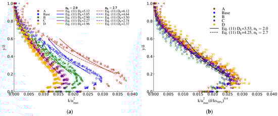 The classical assumption of self-similarity in flow velocities and turbulence statistics has been successfully validated for fully developed flows in open channels, pipes, and boundary layers. However, its application in developing boundary-layer flows in channels with steep slopes and large roughness elements has not yet been thoroughly scrutinized. This study investigates whether turbulence statistics exhibit self-similar behavior when properly scaled in steep-stepped spillways. Specifically, it explores the influence of roughness height ( )—representing the cavity size of a steep-stepped spillway—on turbulence statistics in the non-aerated skimming flow region. Numerical simulations, extensively validated against experimental data, were conducted for a stepped spillway with a fixed slope angle of 51.34°, using five roughness heights ( = 6.25, 3.12, 1.56, 0.78 and 0.39 cm), corresponding to step height-to-length ratios of 10:8, 5:4, 2.5:2, 1.25:1 and 0.625:0.5, respectively. The results show that the dimensionless profiles of turbulent kinetic energy (TKE) at the step edges collapse onto a single curve when rescaled by a factor of with . Likewise, the dissipation rate of TKE follows a similar collapse with . For the turbulent eddy viscosity, an exponent of was adopted based on dimensional analysis, although the values for the smoothest configuration deviate from the curve.
