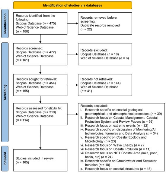Coastal regions face escalating challenges, including climate change, rapid urbanisation, ocean pollution, habitat degradation, and nutrient enrichment, which threaten coastal ecosystem health, biodiversity, and human livelihoods. A comprehensive understanding of coastal hydro-environmental processes, encompassing hydrodynamics, sediment transport driven by waves and currents, and biogeochemical dynamics influencing water quality, is essential for sustainable coastal management. This study presents a global systematic review of assessment methods for these processes, focusing on field data collection, laboratory experiments, numerical modelling, and artificial intelligence techniques. A bibliometric analysis was conducted on 165 peer-reviewed articles from Scopus and Web of Science, adhering to PRISMA 2020 guidelines. The findings reveal a significant shift from conventional standalone methods to integrated approaches, with 31.5% of studies combining field data with numerical models and 20% incorporating AI with field data, emphasising the need for real-time data integration and interdisciplinary strategies to enhance model reliability. This study also introduces a novel process–method–time classification framework that functionally aligns various assessment methods with specific coastal processes. However, challenges such as limited long-term datasets, high computational costs, and data resolution constraints persist. By synthesising global research trends and methodological advancements, this study offers critical insights to support more resilient, adaptive, and data-driven coastal management strategies.