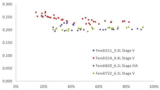 Task-specific off-highway vehicles are typically produced in small volumes, so limited resources must be used in their design. The fuel efficiency benefits of hybridizing an off-highway vehicle are typically in the range of 10–30%, meaning that a simulation tool should ideally be able to predict fuel usage within about ±10%, to support stage-gate design decisions. However, such simulation tools typically require significant cost, setup effort, and simulation expertise. A wheel loader and four agricultural tractors were analyzed with a new tool, “ePOP Concept (v1.0)” from ZeBeyond Ltd. of Leamington Spa, UK, to estimate the benefits of electrification. This method is quick to set up, requiring minimal data preparation and simulation expertise. The results were compared with measured fuel consumption data, and with those of commercially available analysis tools. The errors deriving from ePOP Concept’s BSFC assumptions alone were large at 17% RMS when using a generic value for engine BSFC, but could be improved to 6.7% RMS when applying a readily available minimum BSFC value in the model setup. For future development, a target accuracy of ±10% could potentially be achieved with one-dimensional loss models, requiring minimal extra setup effort, while reducing the subject BSFC errors to 3.9% RMS.