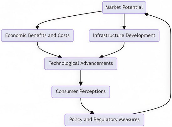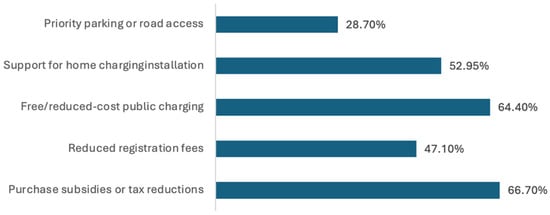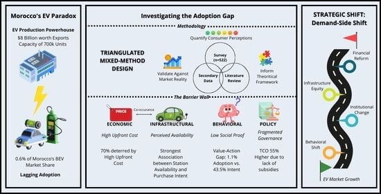 The global shift toward sustainable transport electric vehicles (EVs) is at the core of decarbonization efforts. While advanced economies have achieved their rapid adoption through strong policies and incentives, emerging markets face structural and behavioral barriers. This study investigates the paradox in Morocco, whereby a significant automotive capacity contrasts with a minimal domestic BEV market share of 0.6%, despite 143% growth from a small base, using a four-dimensional framework encompassing financial, infrastructural and energy, policy and institutional, and behavioral–social factors. The research integrates a literature review, a survey (n = 522), and secondary data on charging infrastructure and EV sales. Findings reveal a strong value–action gap: 69% of respondents acknowledged EVs’ environmental benefits yet only 1.1% owned one and 42% had considered buying. The high upfront costs of EVs influenced over 70% of participants, and a significant association was confirmed between charging availability and purchase intent (χ2 = 34.80, p < 0.05). Urban-centric charging, fragmented governance, and skepticism persist as barriers. The study concludes that industrial strength alone cannot ensure adoption without targeted incentives, equitable infrastructure, and cultural shifts in ownership perception, offering key insights for policymakers in emerging economies pursuing sustainable mobility.