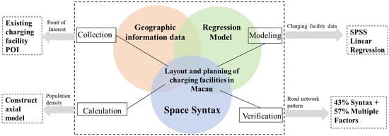 With the global trend towards “carbon neutrality,” the use of electric vehicles is becoming increasingly widespread, leading to new impacts on urban spaces. In the process of allocating resources for urban charging stations, there are widespread issues such as a singular planning approach and inadequate adaptation to actual travel demands. Therefore, this study adopts a method of integrating multi-source data to optimize the planning and layout of public electric vehicle charging facilities in Macau, striving to achieve breakthroughs in theoretical methods and key technologies. The study obtained a determination coefficient of R2 = 0.43 through quantitative analysis, which is within a reasonable range of fitting spatial syntax and charging facility layout. This indicates that there is a moderate positive correlation between the distribution of charging facilities and core indicators such as road network integration and accessibility—about 43% of layout differences can be explained by spatial syntax indicators, and the remaining 57% of differences reserve space for optimizing multiple factors such as population density and parking lot distribution. On this basis, this study compares the layout experience of medium to high-density cities such as Hong Kong and Singapore, and combines the common characteristics of old parishes on Macau Island and new urban areas on outlying islands to explore innovative sustainable development technology paths that are suitable for Macau. This study not only summarizes the key factors and optimization breakthroughs that affect the spatial distribution of charging facilities in Macau, providing basic data and methodological strategies for charging facility planning, but also helps Macau save energy and reduce emissions, build a green city through layout optimization, provide practical reference for the development of land reclamation areas, and provide reference for carbon neutrality and smart city construction in the Guangdong Hong Kong Macau Greater Bay Area.