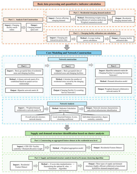 The rapid growth of electric vehicles has intensified the spatial mismatch between the layout of charging infrastructure and user demand, resulting in a structural contradiction in which “local oversupply” and “local shortages” coexist. To systematically diagnose and optimize this issue, this study develops an innovative analytical framework for a “residential area–charging infrastructure” collaborative service network and conducts an empirical analysis using Hongshan District in Wuhan as a case study. The framework integrates actual facility utilization data, complex network analysis, and spatial clustering methods. The findings reveal that the collaborative service network in the study area is overall sparse, exhibiting a distinct “core–periphery” structure, with noticeable patterns of resource concentration and isolation. Residential areas can be categorized into three types based on their supply–demand characteristics: efficient-collaborative, transitional-mixed, and low-demand peripheral areas. The predominance of the transitional-mixed type indicates that most areas are currently in an unstable state of supply–demand adjustment. A key systemic mechanism identified in this study is the significant “collaborative reinforcement effect” between facility utilization rates and network centrality. Building on these insights, we propose a hierarchical optimization strategy consisting of “overall network optimization—local cluster coordination—individual facility enhancement.” This ultimately forms a comprehensive decision-support framework for “assessment—diagnosis—optimization,” providing scientific evidence and new solutions for the precise planning and efficient operation of urban charging infrastructure.