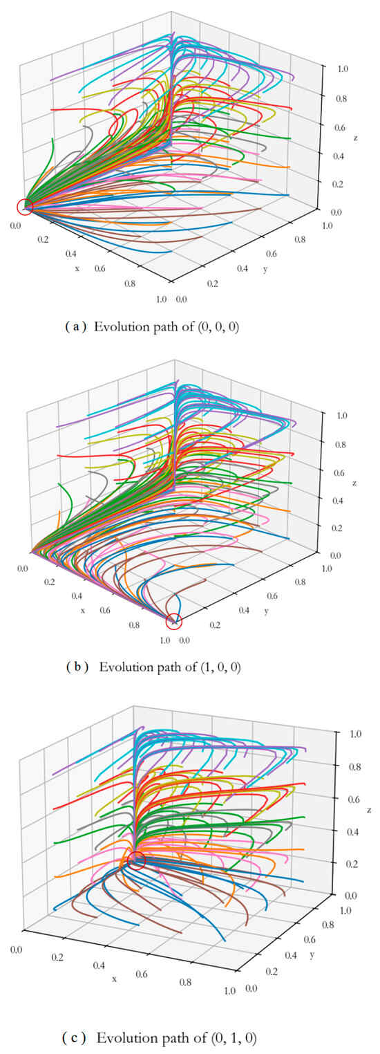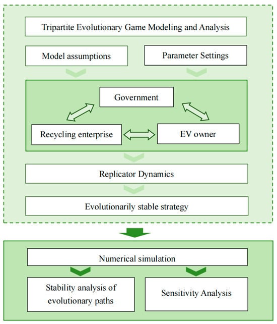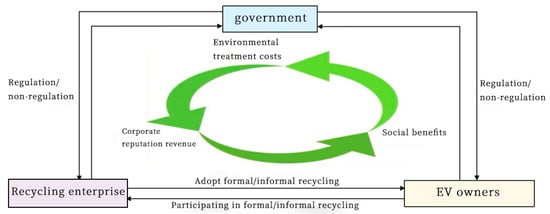 The rapid growth of China’s electric vehicle (EV) market has led to a peak in end-of-life (EOL) power batteries, yet the recycling sector remains dominated by informal operations. This paper incorporates the formal and informal recycling participation behaviours of EV owners into the framework of evolutionary games, systematically examines the mechanism by which governmental incentive and disincentive mechanisms influence the evolutionary stability of each party, and constructs a tripartite evolutionary game model involving the government, recycling enterprises, and EV owners. Numerical simulation experiments conducted using PyCharm 2.3 provide an in-depth exploration of the strategic evolutionary trajectories of each participating agent. The findings indicate that (1) the stable strategy for the game-theoretic system of EOL power battery recycling is government non-regulation, recycling enterprises adopting formal recycling practices, and EV owners participating in formal recycling; (2) strengthening penalties against recycling enterprises will accelerate their transition towards formal recycling strategies, while increasing incentive levels can significantly enhance the steady-state probability of firms opting for formal recycling; (3) government subsidies for EV owners encourage both EV owners and recycling enterprises to adopt formal recycling, with recycling enterprises shifting first. This study enriches the application of evolutionary game theory in the field of EOL power battery recycling and further provides guidance for the healthy development of the recycling industry.