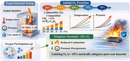 This study investigates how the initial oxygen fraction in a confined space affects post-vent combustion, gas composition, and pressure hazards during thermal runaway (TR) of 58 Ah prismatic Li(Ni0.8Co0.1Mn0.1)O2 lithium-ion cells. Thermal abuse experiments were conducted in a 250 L sealed chamber under five initial oxygen fractions (20%, 15%, 10%, 5%, and 0% O2), with synchronized measurements of cell temperature, vent-jet temperature, chamber pressure, voltage, and post-event gas composition. A first-vent event occurred reproducibly at a cell surface temperature of approximately 155 °C, followed by TR onset at about 170 °C. Although the onset temperatures were only weakly affected by ambient oxygen concentration, the post-vent hazard escalation depended strongly on oxygen availability. As the initial oxygen fraction increased from 0% to 20%, the peak vent-jet temperature increased from 353 °C to 1172 °C, and the peak chamber pressure rose from 90.7 kPa to 523.1 kPa. Gas chromatography showed that H2, CO2, CO, CH4, and C2H4 were the dominant gaseous products. Lower oxygen fractions promoted retention of combustible species, whereas higher oxygen fractions enhanced oxidation and increased the CO2/CO ratio. An oxygen-participation parameter, η, was introduced to quantify the fraction of initially available chamber oxygen consumed during post-vent oxidation. The increase in η was positively associated with oxygen-involved heat release and chamber overpressure. When the accessible oxygen fraction was limited to 10% or below, secondary combustion and pressure buildup were markedly suppressed, although a localized near-field thermal hazard remained significant around 10% O2. These results provide quantitative guidance for enclosure inerting, vent management, and post-vent hazard mitigation in high-energy lithium-ion battery systems.