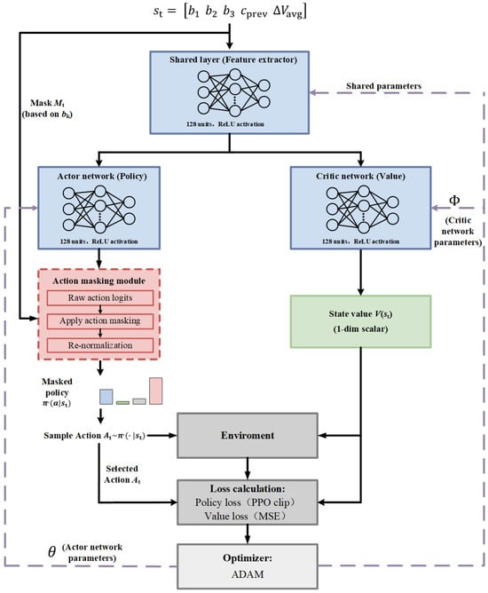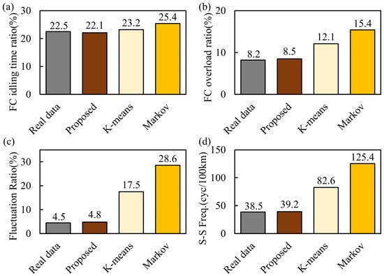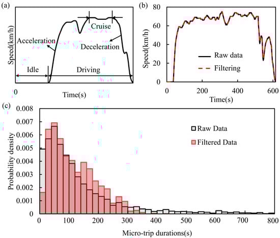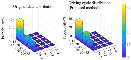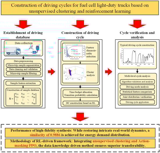 Addressing the lack of high-fidelity test cycles for fuel cell light-duty trucks, this paper proposes an automated driving cycle construction method that integrates unsupervised clustering and reinforcement learning. Firstly, based on large-sample real-world driving data, four libraries of typical driving pattern segments are extracted through dimensionality reduction via Principal Component Analysis (PCA) and K-means clustering. Subsequently, the cycle construction process is formulated as a sequential decision-making problem, and a framework based on the Proximal Policy Optimization (PPO) algorithm, incorporating an action masking mechanism, is designed. This framework innovatively injects macro-level time budget allocation as a hard constraint into the agent’s policy space via action masking, while utilizing micro-level Markov transition probabilities as a soft guide. This dual approach drives the agent to learn an optimal segment concatenation strategy, thereby simultaneously ensuring both the macro-level statistical representativeness and the micro-level driving logic coherence of the synthesized cycle. Validation results demonstrate that the cycle constructed by the proposed method achieves an average relative error of only 7.53% in key characteristic parameters, and its joint speed-acceleration distribution exhibits a similarity as high as 0.9886 with the original data, significantly outperforming traditional methods such as the clustering method, the Markov chain method, and standard driving cycles. This study provides an effective tool for generating high-fidelity driving cycles and testing energy management strategies for fuel cell commercial vehicles.