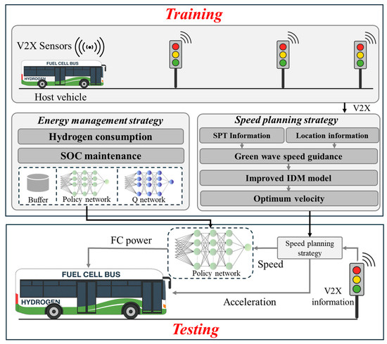 Urban bus operations under signalized traffic conditions are characterized by frequent stop-and-start behaviors which significantly degrade fuel economy, especially for fuel cell buses (FCB). In this paper, a collaborative optimization method is proposed that combines speed planning and energy management for FCB in this situation. The method calculates the target speed of FCB using traffic light phase information and the remaining signal time. With an intelligent driving model, the vehicle can adjust its speed in advance when approaching intersections so it can pass through intersections without stopping. At the same time, a learning-based energy management strategy is used to reasonably share power between the fuel cell and the battery. The results indicate that the method proposed in this paper reduces hydrogen consumption by approximately 11.3% compared to the standard method.