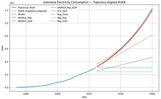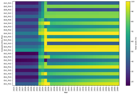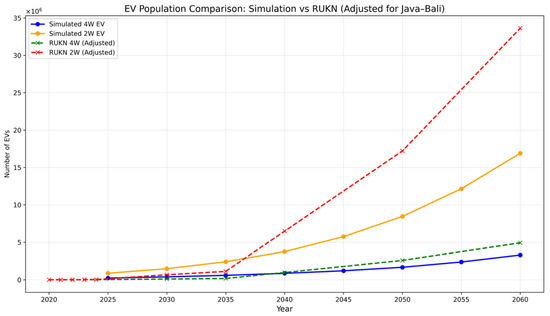 Indonesia’s long-term climate strategy targets net-zero emissions by 2060. In this context, this paper develops a simulation for the Java–Madura–Bali (Jamali) grid to quantify the joint impact of electric vehicle (EV) uptake and rooftop photovoltaic (PV) integration on system performance from 2025 to 2060. Historical statistics and national planning projections were used to calibrate annual capacity, peak load, and energy trajectories, which were downscaled to hourly resolutions. EV charging demand, generated using state-of-charge-dependent Alternating Current (AC) and Direct Current (DC) load profiles, and PV output were modeled across a 36-year span under a 5 × 5 policy matrix, producing a 900-scenario-year. These scenarios range from Business-as-usual (BAU) to aggressive interventions (including subsidies, regulation, and smart management). The scenarios were evaluated using a min–max composite index weighting supply–demand balance, production–consumption balance, and policy cost. Based on this simulation inputs, results indicate that the scenario combining regulated EV growth with BAU PV adoption achieves the highest average composite score. While charge-time management strategies provided the best adequacy, highly interventionist EV–PV packages were the most expensive without delivering proportional benefits. The study concludes that, with this current parameter input, moderate and regulation-driven strategies outperform aggressive interventions when adequacy, balance, and cost are jointly considered.