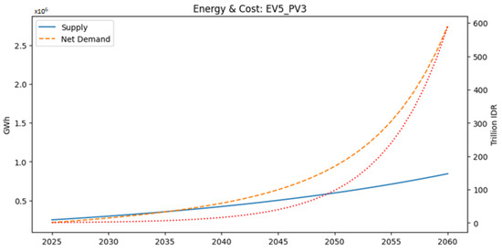 Indonesia’s long-term climate strategy targets net-zero emissions by 2060. In this context, this paper develops a simulation for the Java–Madura–Bali (Jamali) grid to quantify the joint impact of electric vehicle (EV) uptake and rooftop photovoltaic (PV) integration on system performance from 2025 to