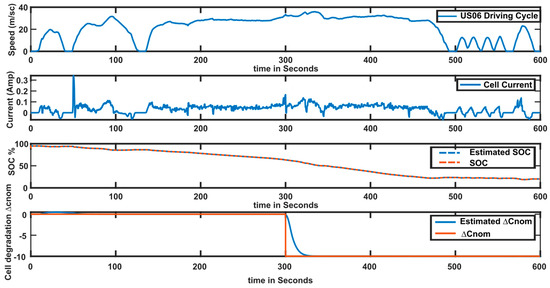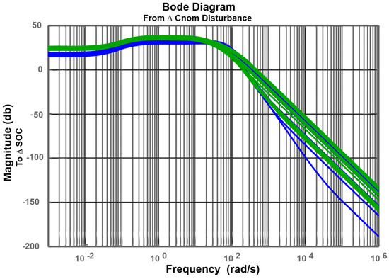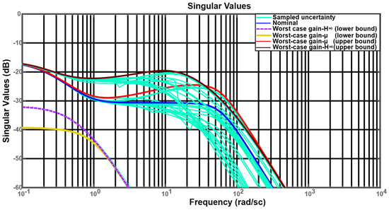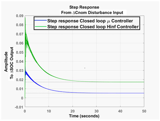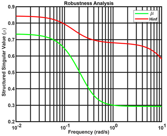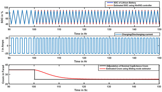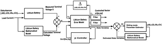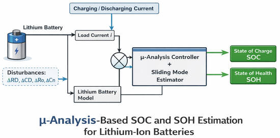 Because of their great energy density and efficiency, lithium-ion batteries (LIBs) are essential to renewable energy systems and electric vehicles. Effective battery management requires precise estimation of the state of health (SoH) and state of charge (SoC). In order to overcome the difficulties caused by parameter fluctuations and real-world disturbances, this work presents a novel μ-analysis-based methodology designed to improve the resilience and accuracy of online SoC and SoH estimations in LIBs. In contrast to conventional techniques, the suggested strategy successfully manages both structured and unstructured uncertainties in battery systems by combining μ-analysis with model-based estimation. The framework creates an estimator that is resistant to parameter drift and outside perturbations by combining model-based estimation approaches with μ-analysis tools. Simulations using UDDS, US06, and HWFET driving cycles are used to verify its performance. When evaluating battery health and condition in dynamic and uncertain operating scenarios, the μ-analysis-based estimator demonstrates superior accuracy compared to conventional H∞-pole placement filter methods. The proposed approach enhances system robustness, achieving an 8 dB improvement in disturbance attenuation, as verified through MATLAB/Simulink. Stability analysis reveals the μ-analysis controller maintains robust performance up to ‖∆‖∞ = 3.5 at 10 Hz, compared to only ‖∆‖∞ = 1.5 for the H∞-pole placement controller—demonstrating significantly greater tolerance to parameter variations and unmodeled dynamics. These capabilities make the μ-analysis approach particularly suitable for electric vehicle applications requiring next-generation battery management systems.