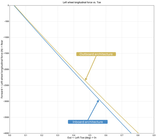 The In-Wheel Motor represents a non-conventional propulsion architecture in which the electric motor is integrated into the wheel, offering advantages such as improved energy efficiency, individual torque control, and drivetrain simplification. In this study, two architectures, inboard and outboard, were developed using an original three-dimensional motor–brake–suspension–steering assembly model, in which disk brake position and In-Wheel Motor integration act as primary design drivers influencing vehicle dynamics. Both architectures were developed in CATIA V5 and exported to Altair Motion 2025 for multibody dynamics simulations. The study evaluates the impact of inboard versus outboard disk brake positioning on vehicle dynamics and provides a qualitative assessment of the associated architectures in terms of mechanical complexity, serviceability, sealing requirements, bearing load asymmetry, and packaging constraints. The results indicate that the inboard architecture exhibits more linear and stable kinematics and compliance (K&C) behavior compared to the outboard configuration, at the expense of increased mechanical complexity and reduced serviceability. By contrast, the outboard architecture preserves a simpler, more conventional MacPherson-like layout with a lower component count and improved service access but is dynamically outperformed under the imposed geometric constraints of the present study.