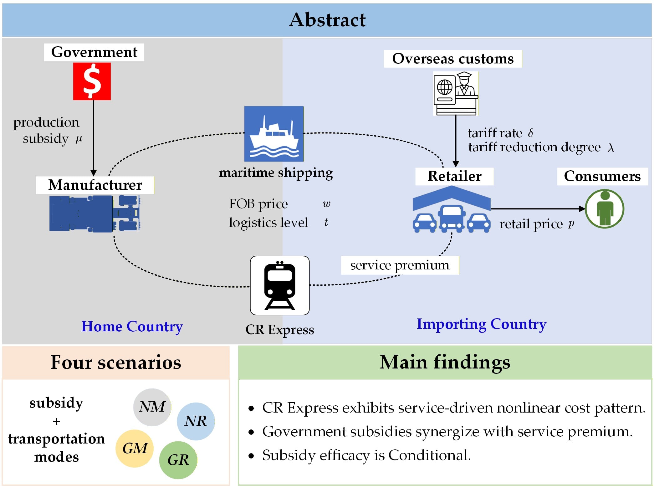 This paper investigates the coordination between logistics and policy decisions for electric vehicle (EV) exports under the Belt and Road Initiative. Focusing on the two modes—maritime shipping and the China Railway Express (CR Express)—along with government production subsidies, import tariffs, and service premium, a Stackelberg game model for a cross-border supply chain comprising a domestic manufacturer and an overseas retailer is constructed. The equilibrium outcomes under four scenarios formed by combining subsidy policies and transportation modes (Models NM, NR, GM and GR) are compared theoretically and numerically, with further evaluation of capacity constraints and power structures, as well as the robustness verification of the core findings. Results show that the CR Express mode exhibits a service-driven nonlinear cost pattern, where its service premium amplifies positive market responses. Its appeal to the manufacturer, however, is tightly constrained by fixed cost. Furthermore, government subsidies can overcome this barrier by synergizing with the service premium, turning the CR Express into a relatively advantageous strategy. Moreover, subsidy efficacy is conditional, depending heavily on the service premium level and logistics cost coefficient, leading to a proposed differentiated subsidy framework. This study offers a theoretical basis for corporate logistics strategy and targeted policy design.