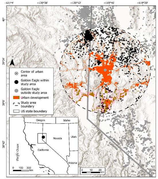 Despite many raptors establishing urban populations globally, Golden Eagles (Aquila chrysaetos) tend to avoid urban areas, including while in flight. The contiguous cities of Reno and Sparks, NV, USA, host a dense guild of breeding raptors (>10 species) but Golden Eagles