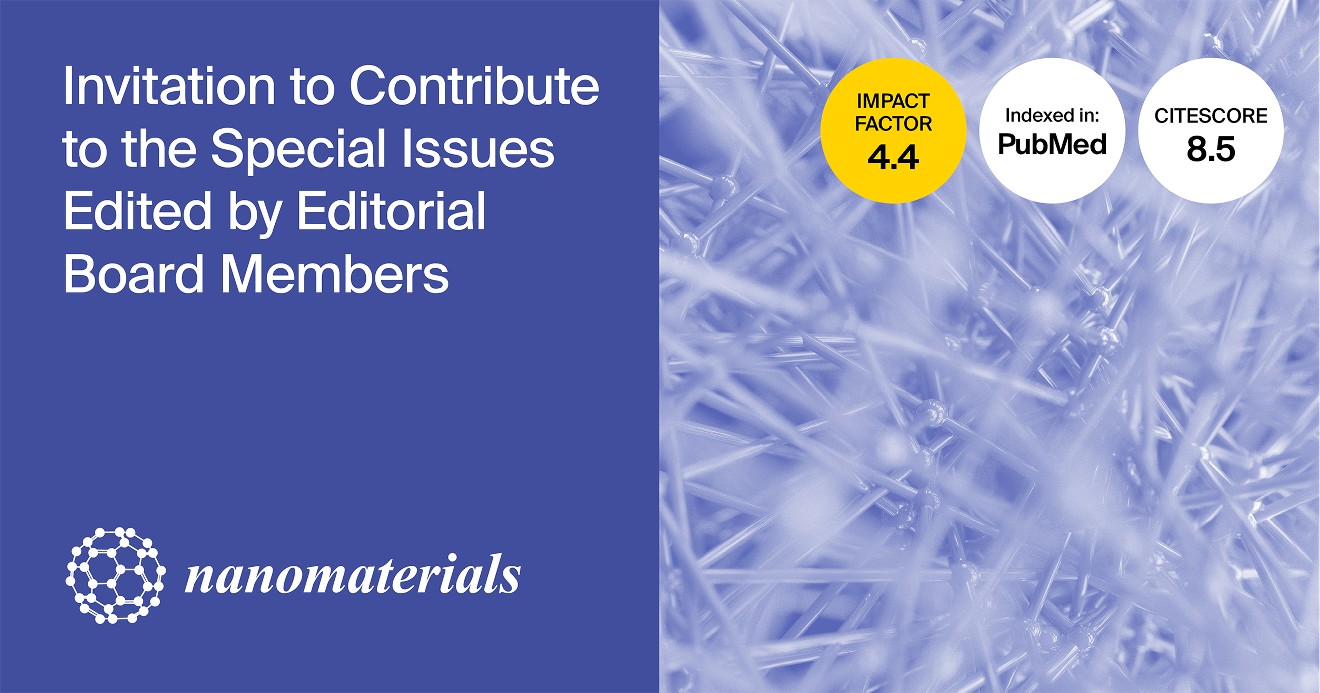 The journal Nanomaterials (ISSN: 2079-4991) invites researchers to contribute original research articles and reviews to a series of Special Issues curated by our Editorial Board Members. These Special Issues provide an excellent platform for sharing research in various areas of nanomaterials science. Please find more information about the journal’s Special Issues below.