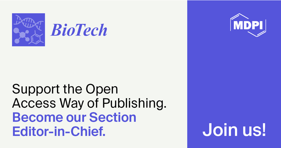 BioTech (ISSN: 2673-6284) is currently recruiting a prominent expert working in the field of environmental biotechnology to join our Editorial Board as the Section Editor-in-Chief (SEiC) to lead this Section. This is in order to promote the academic exchange of scientists and support the Editorial Board with additional expertise.