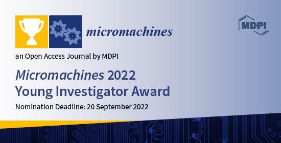 We are pleased to announce that Micromachines (ISSN: 2072-666X) is now inviting nominations for the Micromachines 2022 Young Investigator Award. This prize will be given to one young investigator in recognition of his/her excellence in the field of micro/nano-scaled structures, materials, devices, and systems and their applications. All nominations will be assessed by an Evaluation Committee led by the Editor-in-Chief.