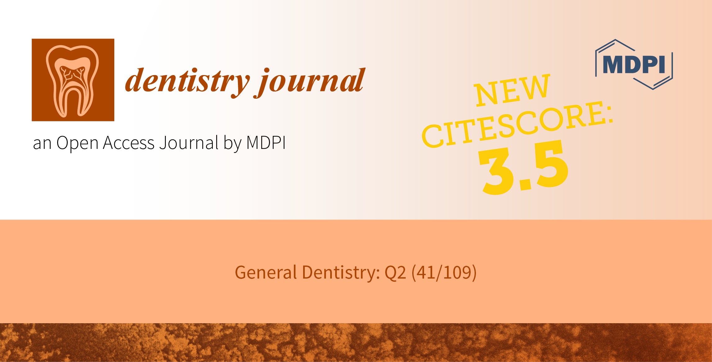 We are pleased to report that the CiteScore of the Dentistry Journal (ISSN: 2304-6767) has increased to 3.5 (from 2.2). It now ranks 41/109 (Q2) in the "General Dentistry” category. For full details of the current CiteScore release, please refer to the journal’s source profile at the following link: https://www.scopus.com/sourceid/21100901062.