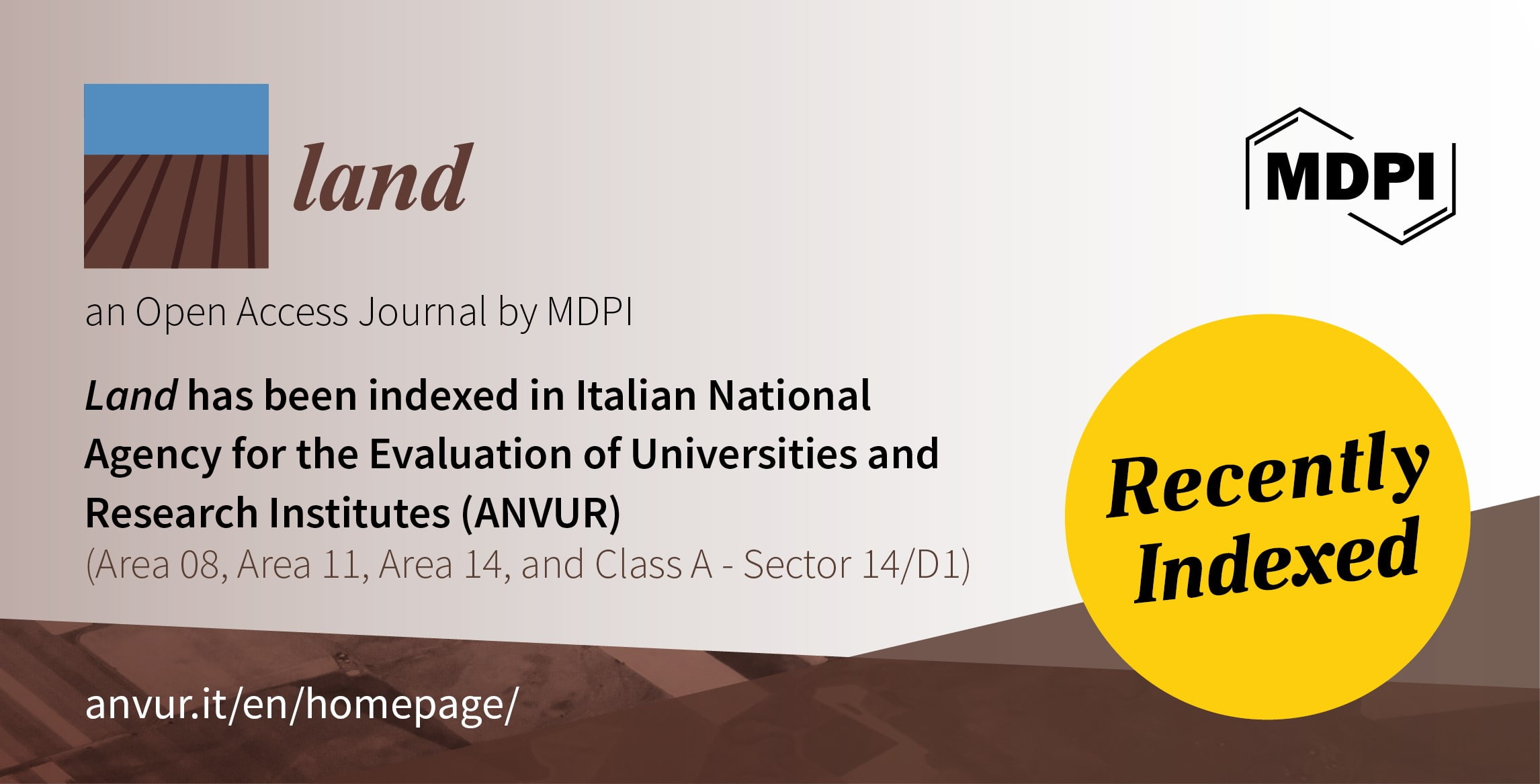 We are pleased to inform you that the open access journal Land (ISSN: 2073-445X, IF: 3.905) has been indexed in the Italian National Agency for the Evaluation of Universities and Research Institutes (ANVUR): Area 08, Area 11, Area 14, and Class A - Sector 14/D1. We would like to extend our sincerest gratitude to all authors, reviewers, and editors who have contributed to this journal and enabled this achievement.