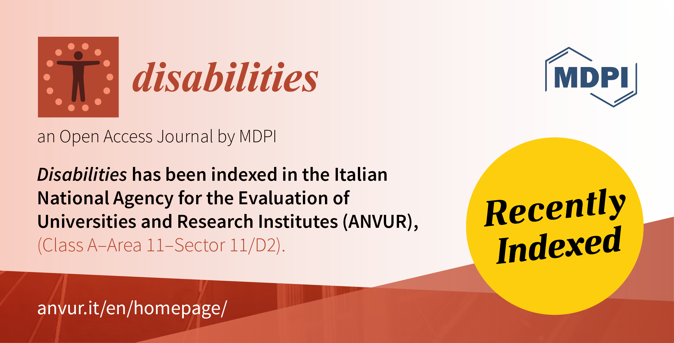 We are pleased to announce that the journal Disabilities (ISSN: 2673-7272) has been indexed in the Italian National Agency for the Evaluation of Universities and Research Institutes (ANVUR) (Class A–Area 11–Sector 11/D2).