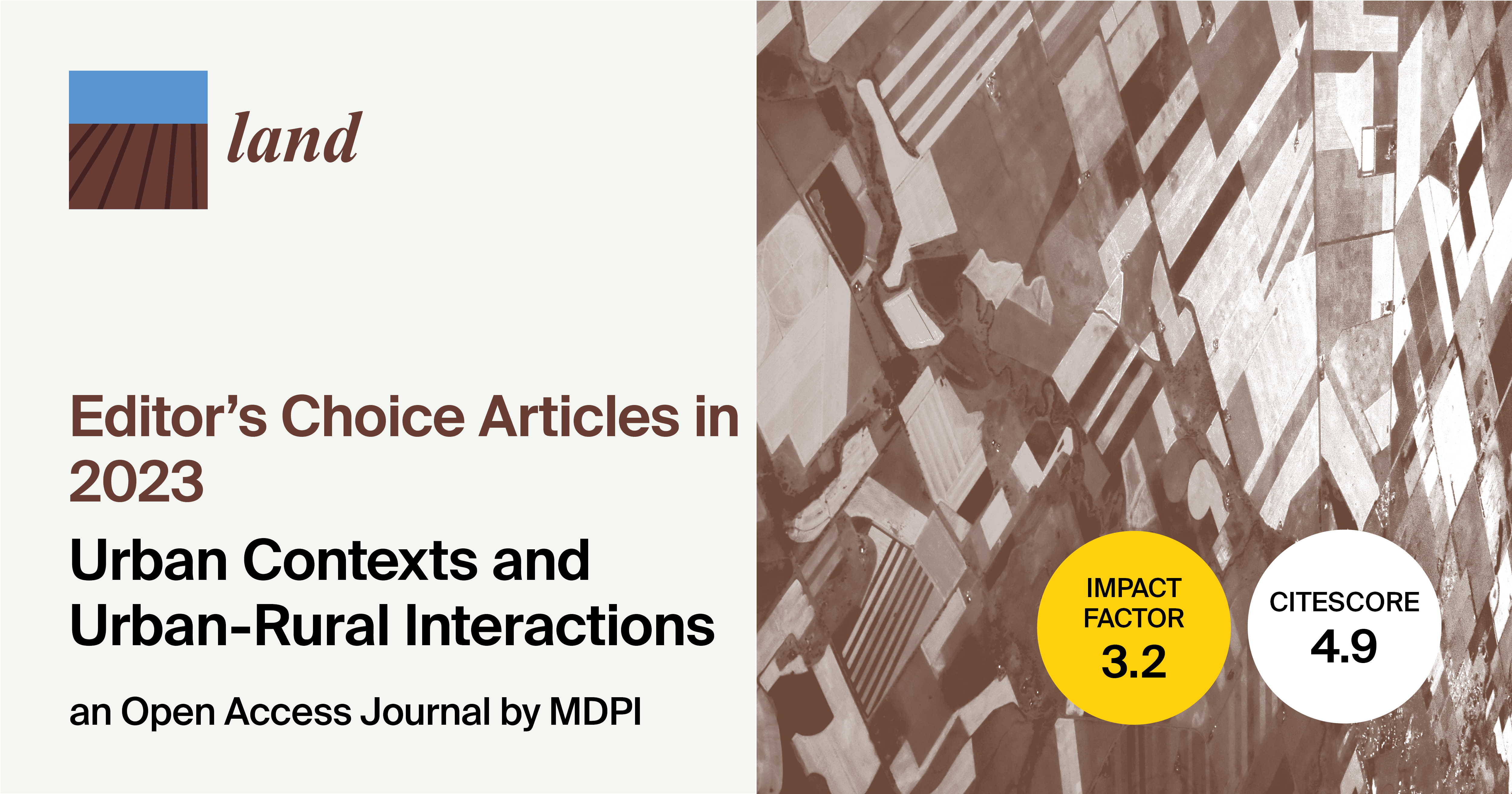 Editor's Choice Articles are selected based on suggestions from Land’s Academic Editors. The Editors select a small number of recently published articles that they consider particularly interesting to our readers or important in their respective fields of research. You are welcome to read the Editor's Choice Articles related to urban contexts and urban–rural interactions, a curated list of high-quality articles published in Land (ISSN: 2073-445X) in 2023. The full list of Editor's Choice Articles can be viewed at the following link: https://www.mdpi.com/journal/land/editors_choice. The list of relevant papers can be seen below.