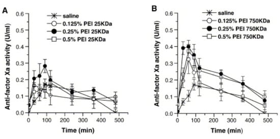 In a study conducted recently, the effect of positive-charged polyethylenimine (PEI) on the nasal absorption of LMWH (Enoxaparin) []. In this study, the effect of different concentrations of PEIs (0.5%, 0.25% and 0.125%) with different molecular weights (25 kDa, 750 kDa, 1000 kDa) on absorption was demonstrated. The efficacy of PEIs on enhancing nasal bioavailability of LMWH was PEI-1000 kDa > PEI-750 kDa > PEI-25 kDa, respectively. Besides, when PEI-1000 kDa was used at a concentration of 0.25%, the absolute and relative bioavailability of LMWH was increased four-fold when compared to the control formulation (isotonic saline) (Figure 6).