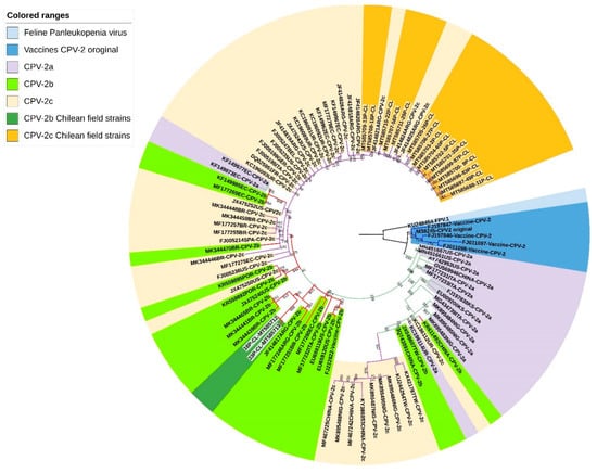 Phylogenetic tree using the maximum likelihood (ML) method. Phylogenetic inferences were carried out using complete nucleotide sequences of the VP2 gene of CPV-2a, CPV-2b and CPV-2c, including different countries in Europe (GER: Germany; ITA: Italy; SPA: Spain; FRA: France; BEL: Belgium; and POR: Portugal), Asia (CHINA; TW: Taiwan; and KS: South Korea), Africa (NIG: Nigeria), North America (US: United States) and South America (ARG: Argentina; UY: Uruguay; EC: Ecuador; BR: Brazil; including the viral variants from Chile: CL). Each sequence was identified according to GenBank accession number, country of origin and viral variant. The tree included as its root an FPV sequence. The blue branches include the variants associated with the reference gene for CVP-2 and commercial vaccines (CVP-2); the green, red and purple branches indicate the viral variants CVP-2a, CVP-2b and CVP-2c, respectively.