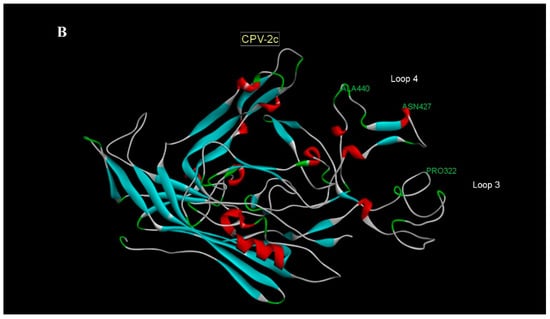 In the viral variants of the study, substitutions were identified in the barrel β structure (CPV-2b: A516S; CPV-2c: A188S; and V463I), in loop 3 (CPV-2b: A297N and Y324I; CPV-2c: T322P and A379S) and loop 4 of the triple spike (D427N and T440A) (Figure 2).
