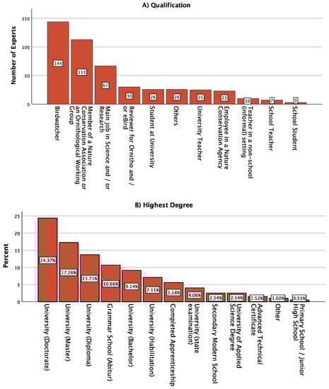 In Step III, 197 experts took part in the online survey. The average age was 44.42 ± 16.23 years, with 73 females (37.1%), 123 males (62.4%), and 1 person who did not specify gender (0.5%). Participants were asked to indicate their qualification as an expert, e.g., birdwatcher or other. Multiple responses were possible. Most of the respondents reported that they were birdwatchers, followed by members of a nature conservation association or an ornithological working group (Figure 2A). The most commonly reported highest degree was a university doctorate. This was followed by a master’s degree and diploma (Figure 2B). Birding specialization was 20.91 ± 4.66 (out of a maximum of 28 and a minimum of 5 points, Figure 2C). There was no correlation between the birding specialization score and the number of species selected, suggesting that more skilled people are aware of the difficulties of bird identification. Age was significantly negatively correlated with the number of species selected (r = 0.204, p = 0.004). Older respondents selected fewer species. Females selected a similar number of species as males (T = 1.56, p = 0.12).