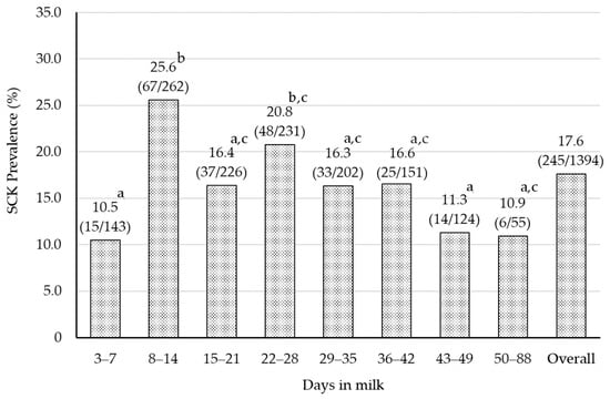 The prevalence of SCK categorized by DIM. The numbers in parentheses in the figure are the number of SCK cows divided by the number of cows tested. The chi-square test was used to determine that there was a significant difference between different superscripts (p = 0.001). Days in milk were separated by one-week intervals. Sampling was not conducted during 1–2 DIM due to the influence of calving. Cows in each week from week 8 to and throughout week 13 were treated as the same group because the numbers were limited.