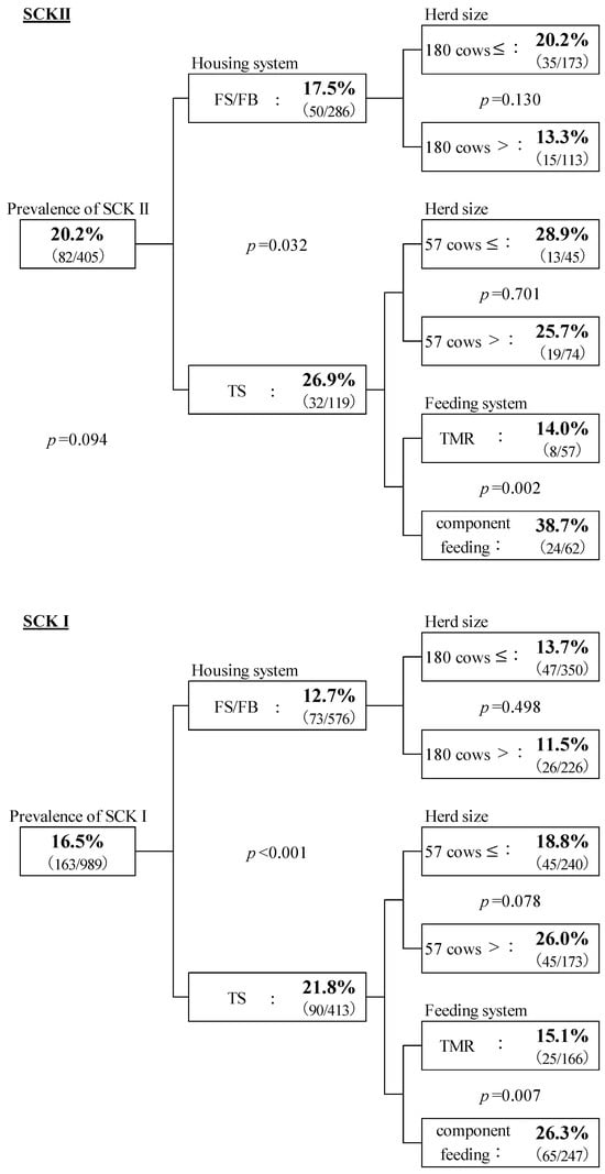 Figure 2 shows the association of SCK I and SCK II prevalence with the management system. The prevalence of SCK II, 20.2% (82/405), tended to be higher than that of SCK I, 16.5% (163/989, p = 0.094). The prevalence of both SCK II and SCK I was significantly higher (p = 0.032 and p < 0.001) in TS (26.9% and 21.8%) than in FS/FB (17.5% and 12.7%). This result is consistent with previous studies that suggested the incidence of ketosis was 1.6–2.6 times higher in TS than in FS [,].