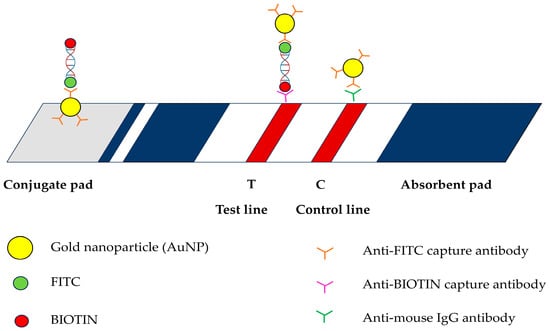 Schematic illustration of lateral flow assay used in this study including gold nanoparticles (AuNP); fluorescein isothiocyanate (FITC); BIOTIN; anti-FITC capture antibody; anti-BIOTIN capture antibody; and anti-mouse IgG antibody.