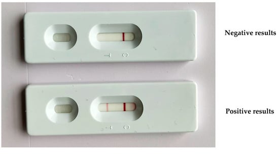 The LF strip device displayed a negative result of PCR products with one band of the control line (C) and a positive result with PCR products that exhibited a band at both the test (T) and control lines.