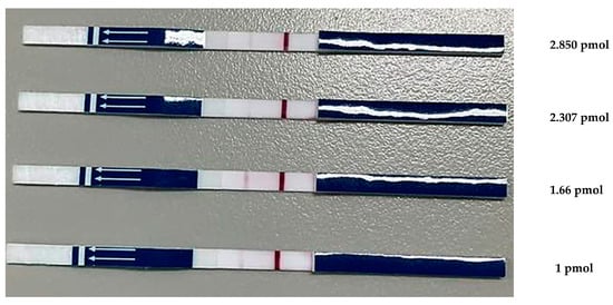 The DNA probe concentration affected the clarity of the LF strip test lines (Figure 3). An optimal concentration of DNA probe-FITC was required to produce a clear signal. Testing FITC-DNA probe concentrations of 1, 1.66, 2.307, and 2.805 pmol with an LF strip reduced test costs by optimizing the probe concentration. The results obtained at concentrations of 1, 2.307, and 2.805 pmol were characterized by uncertainly, producing inconclusive positive indications. A concentration of 1.66 pmol exhibited a conspicuous and well-defined signal. Therefore, this concentration was used in subsequent experiments.