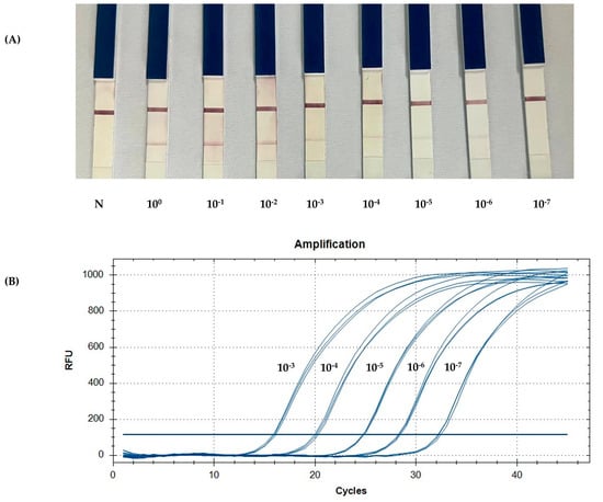 To determine the LoD, the standard plasmid pGEMT-dsb, prepared in a previous study, was used []. The detection limitations of the PCR-LFB and qPCR assays were compared by 10-fold serial dilutions of the pGEMT-dsb plasmid from 100 to 10−7 copies/µL.
