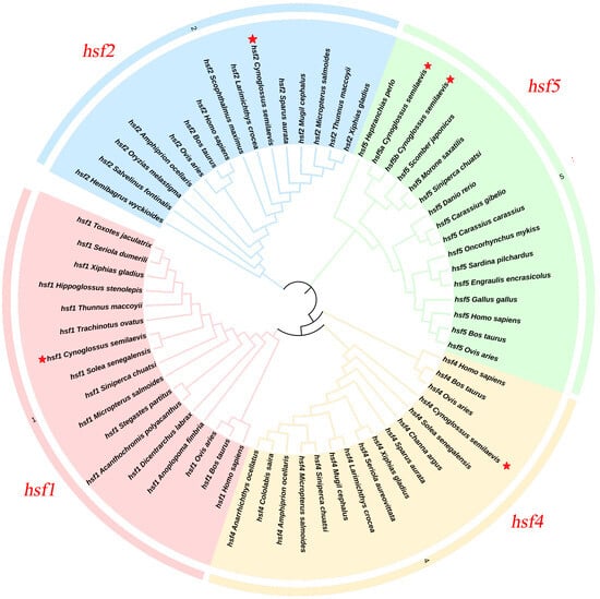 The hsf1, hsf2, hsf4, hsf5a, and hsf5b sequences of multiple species constitute a phylogenetic tree, and the tongue sole is highlighted in red five stars to show its evolutionary position.