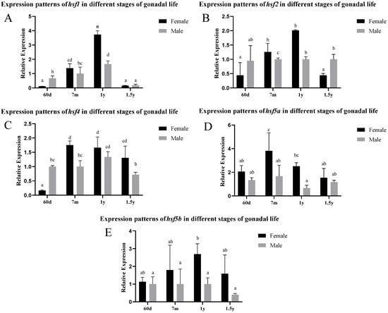 According to the analysis of the gonad expression pattern in Figure 2, the expression levels of hsf1, hsf2, and hsf4 in female individuals reached their peak at the age of 1 year, and were significantly higher than those in males from 7 months to 1 year. hsf5a and hsf5b maintained a high level of expression in female gonads, and the peak values appeared at 7 months and 1 year, respectively. In male individuals, the expression levels of hsf1, hsf2, and hsf4 were significantly higher than those of female individuals at 60 days and 1.5 years.