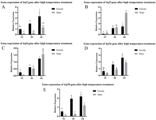 After high-temperature stimulation, the expression of the hsf gene increased significantly, and the longer the stimulation time, the greater the increase in expression. Among these genes, hsf1, hsf5a, and hsf5b were highly expressed in female fish in the NC group, and the expression level in female fish was also significantly greater than that in male fish after stimulation. There was no significant difference in hsf2 or hsf4 expression between male and female fish in the NC and 3d treatment groups, and the expression level in male fish was greater than that in female fish after 6d of stimulation (Figure 4).