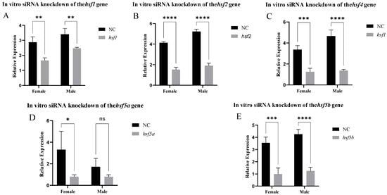 Expression of the hsf gene in C. semilaevis after knockdown in vitro ((A): hsf1; (B): hsf2; (C): hsf4; (D): hsf5a; (E): hsf5b). Significant difference (p ≤ 0.05). Bars represent mean ± SD from experiments performed in triplicate. Significant difference (ns: p > 0.05, *: p ≤ 0.05, **: p ≤ 0.005, ***: p ≤ 0.0005, ****: p ≤ 0.0001).