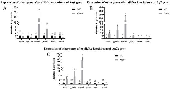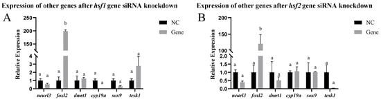 After siRNA-mediated knockdown of the hsf gene in the ovarian cells, the expression of other related genes changed. After the knockdown of the hsf1 gene using siRNA, the expression of the cyp19a, dmrt1, and tesk1 genes increased significantly, whereas the expression of the other genes did not change significantly. After the knockdown of the hsf2 gene using siRNA, the expression of the sox-9, neurl3, cyp19a, dmrt1, and tesk1 genes decreased significantly, whereas the expression of the foxl2 gene did not change significantly. After knocking down the hsf4 gene using siRNA, the expression of the tesk1 and foxl2 genes increased significantly, whereas the expression of the other genes did not change significantly. After knocking down the hsf5a gene using siRNA, the expression of the dmrt1 gene increased significantly, whereas the expression of the other genes did not change significantly. After hsf5b siRNA-mediated knockdown, the expression levels of the sox-9, neurl3, cyp19a, and dmrt1 genes significantly increased, whereas the expression levels of the other genes did not significantly change (Figure 7).