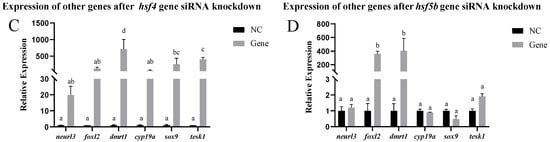 Expression of other genes in the testis cells of the C. semilaevis hsf gene after siRNA-mediated knockdown ((A): hsf1; (B): hsf2; (C): hsf4; (D): hsf5b). Significant difference (p ≤ 0.05). Bars represent mean ± SD from experiments performed in triplicate. Different letters indicate significant differences.