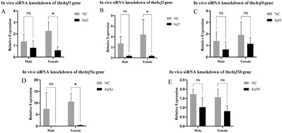 Expression of the hsf gene in C. semilaevis after knockdown ((A): hsf1; (B): hsf2; (C): hsf4; (D): hsf5a; (E): hsf5b). Significant difference (p ≤ 0.05). Bars represent mean ± SD from experiments performed in triplicate. (ns: p > 0.05, *: p ≤ 0.05).