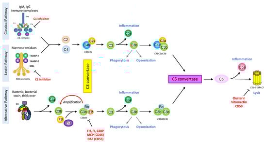 The first description of the complement system in 1890 assigned it antimicrobial functions []. However, due to its composition and the plurality of its actions, the complement system was very difficult to study and progress was dependent on the technologies available. Since the 1950s, with the development of protein chromatography and electrophoresis, data have never stopped to accumulate []. Complement is one of the first lines of defense against pathogens or stressed host cells, and can be triggered, depending on the activator, by three different pathways: classical, lectin and alternative. They lead to the formation of C3 and C5 convertases and the common terminal pathway (Figure 1). The complement proteins interact in a highly regulated proteolytic cascade to opsonize pathogens, induce inflammation, interact with cells of adaptive immunity, and maintain homeostasis []. The complexity of the complement system is not only due to its composition or its numerous functions (immune or non-immune) but also its ability to act extracellularly or intracellularly.