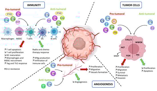 Overview of the complement functions in the context of cancer. In a tumor context, the complement system may impact the immunity, angiogenesis and the phenotype of the tumor cells. Immunity: the same complement proteins may impact several immune cells positively or negatively depending of the model or cancer type. The pro-tumoral activity is mostly involved in the recruitment of immune cells and in the suppression of their anti-tumoral response. The anti-tumoral activity is linked to an improvement of the response to therapy and an increase in the immune cells infiltration. Angiogenesis: depending on the model, the complement proteins may promote or hamper tumor growth by favoring or inhibiting the neoangiogenesis. Tumor cells phenotype: by modulating the signaling pathways Erk1/2, AKT and PI3K the complement proteins stimulate tumor growth. In other models, the modulation of other signaling pathway (WWOX and FAS) by complement proteins favor the apoptosis of tumor cells. The figure is created with BioRender.com.
